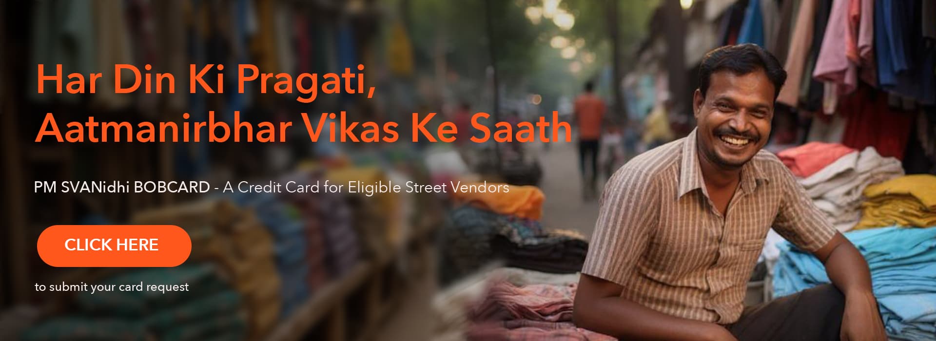 Click HerePM SVANidhi BOBCARD makes your daily business simpler - with interest-free days, UPI payments, EMIs, and rewards.